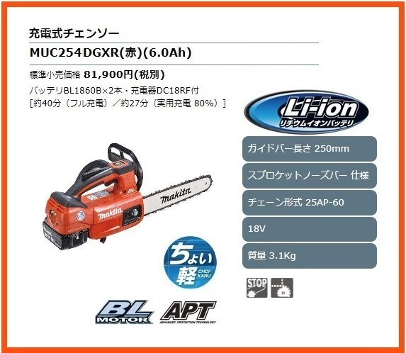 > マキタ 250mm 18V 充電式チェンソー MUC254DGXR (赤) [6.0Ah]【スプロケットノーズバー仕様】 ■安心のマキタ純正/新品/未使用■