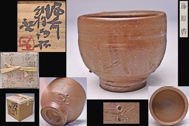 > 藤原啓 ★ 備前 緋襷 ぐい呑 ★ 共箱 栞 ★ 人間国宝 ★ 緋襷の景色良く氏らしい力強い造形 ★ 検 金重陶陽 藤原雄 西岡小十