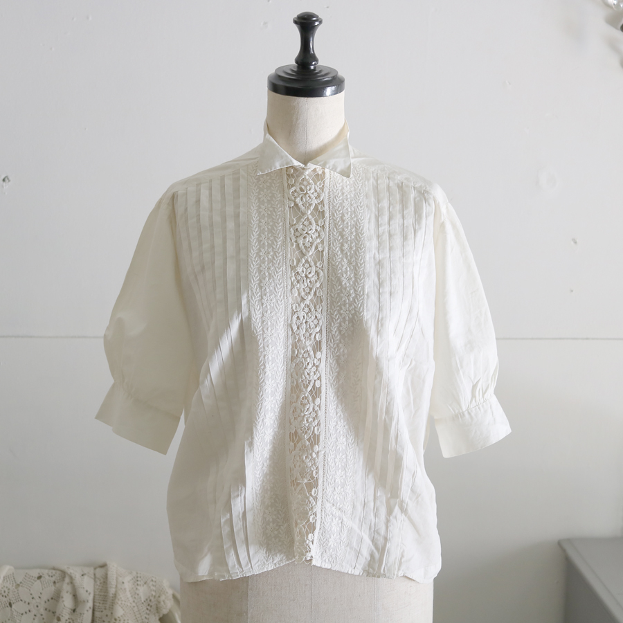 - 1800年代 フランスアンティーク 刺繍 レース ブラウス ビンテージ 古着 ピンタック ふんわり袖 コットン フランス映画のようなお洋服