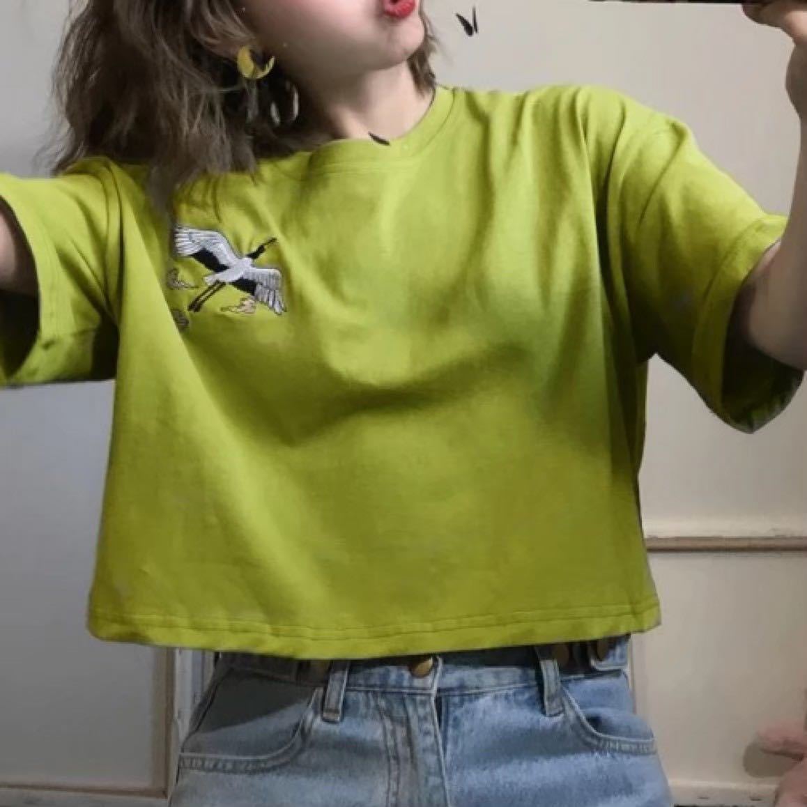 - Tシャツ トップス 半袖 ショート丈 鶴 シャツ カットソー 緑 グリーン XL
