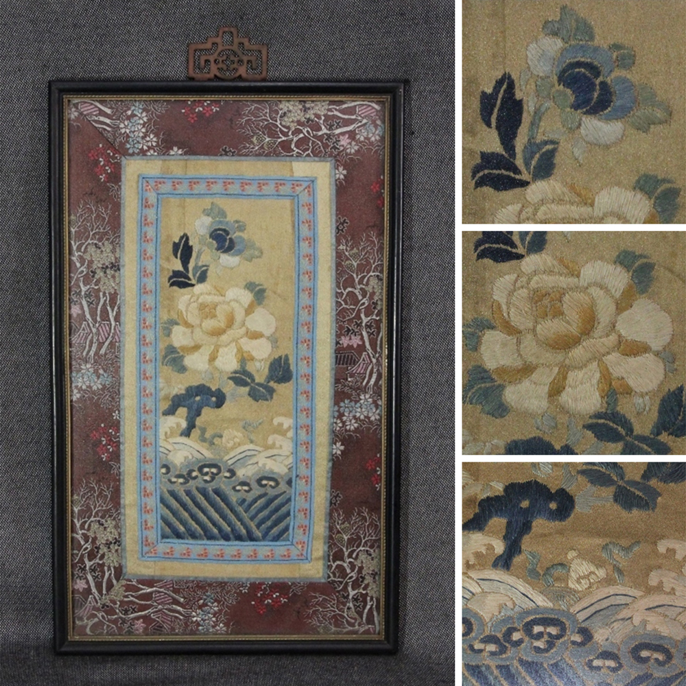 - 【中国美術】 ★ 織繍 黄地花卉紋繍片 ★ 清朝期 牡丹 海波 刺繍文様 文房清供 検 清代清時代額装染織古裂古布古美術古玩古董骨董唐物