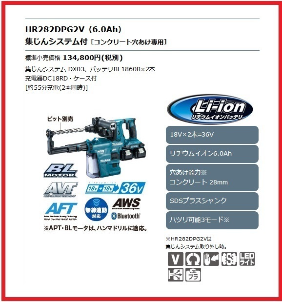 > マキタ 28mm 18V 充電式集じんシステム付ハンマドリル HR282DPG2V (6.0Ah) [コンクリート穴あけ専用]【18V+18V→36V】 ■新品/未使用■