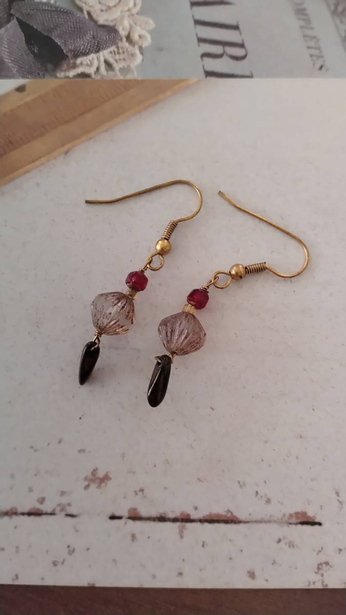 - 訳あり 赤×薄ピンク×茶 揺れるビーズ・ピアス