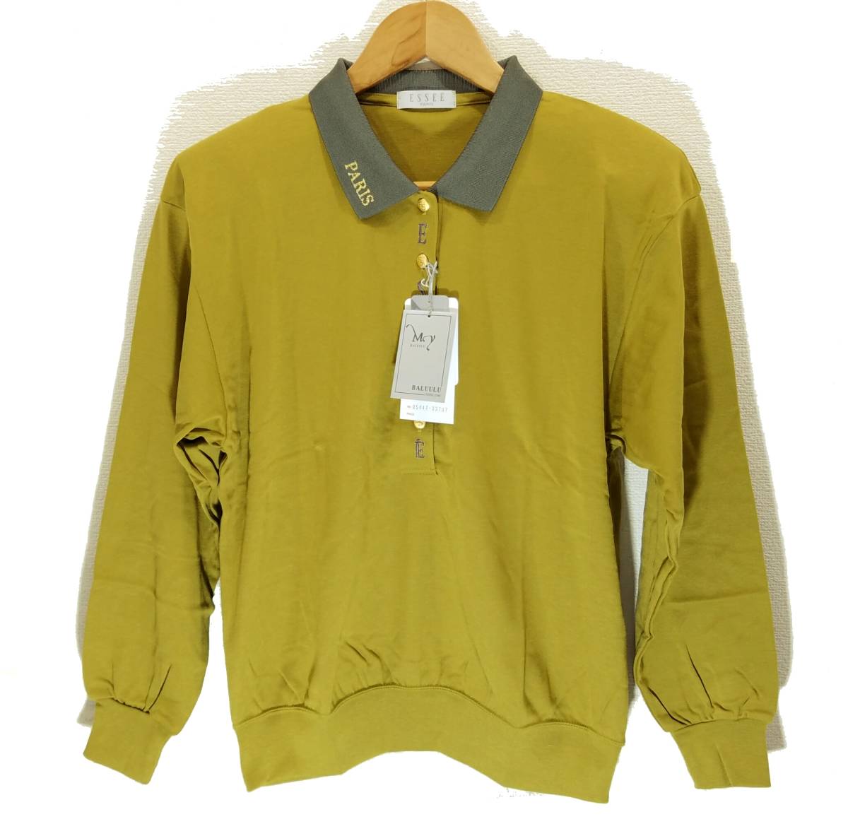 > 送料600円~新品ESSEE PARIS ゴルフ 長袖シャツ グリーンイエロー系カーキ刺繍入りポロ襟レディース金ボタン日本製コーマ糸エッセドパリス