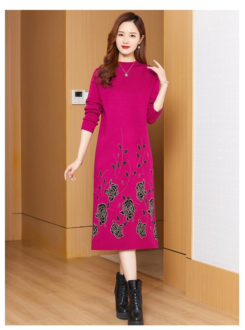 - 【ワインレッド花柄色★Lサイズ】長袖 ひざ丈 ニットワンピースおしゃれ