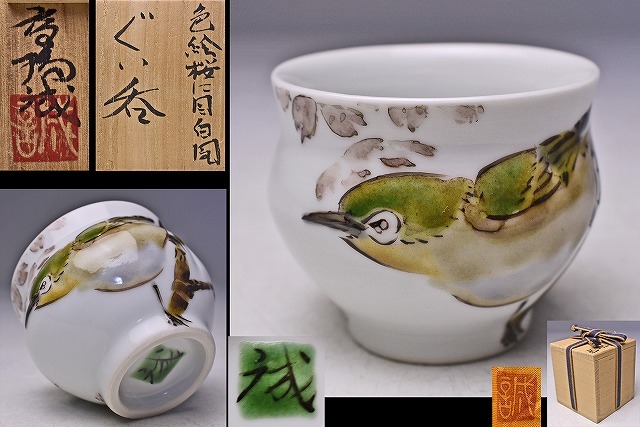 - 高橋誠 ★ 色絵 桜に目白図 ぐい呑 ★ 共箱 共布 ★ 師:人間国宝 藤本能道 ★ 愛らしく雅で見事な筆致の逸品 ★ 酒器 ★