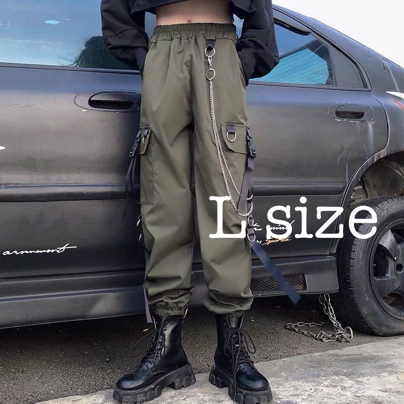- ジョガーパンツ テーパードパンツ チェーン ストリート カーゴパンツ ユニセックス 男女兼用 カーキ 緑 L