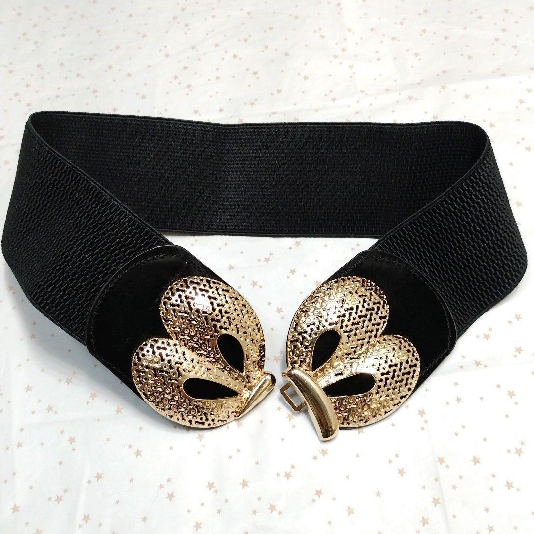 - 【ブラック】蝶々バックル約6cmゴムベルト ゴールド 金レディース