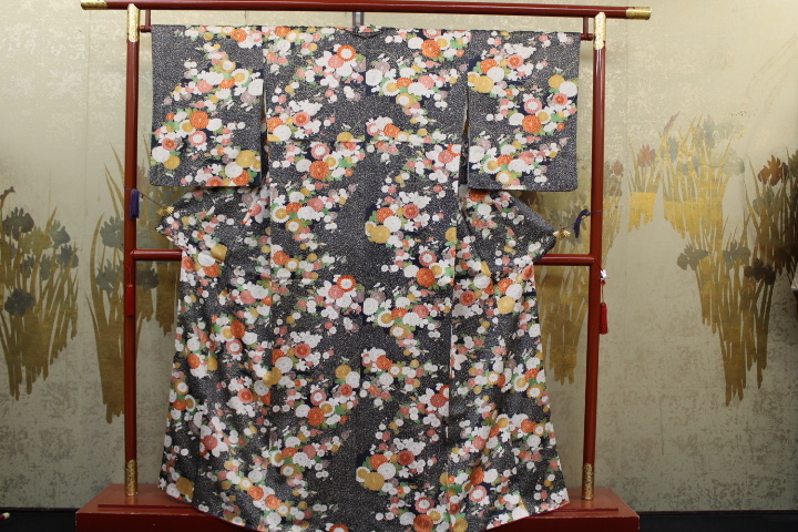 > きもの今昔6166 小紋のきもの 広衿袷手縫い仕立て 正絹綸子地黒霜降り地 梅覗き菊の尽くし 身丈157㎝