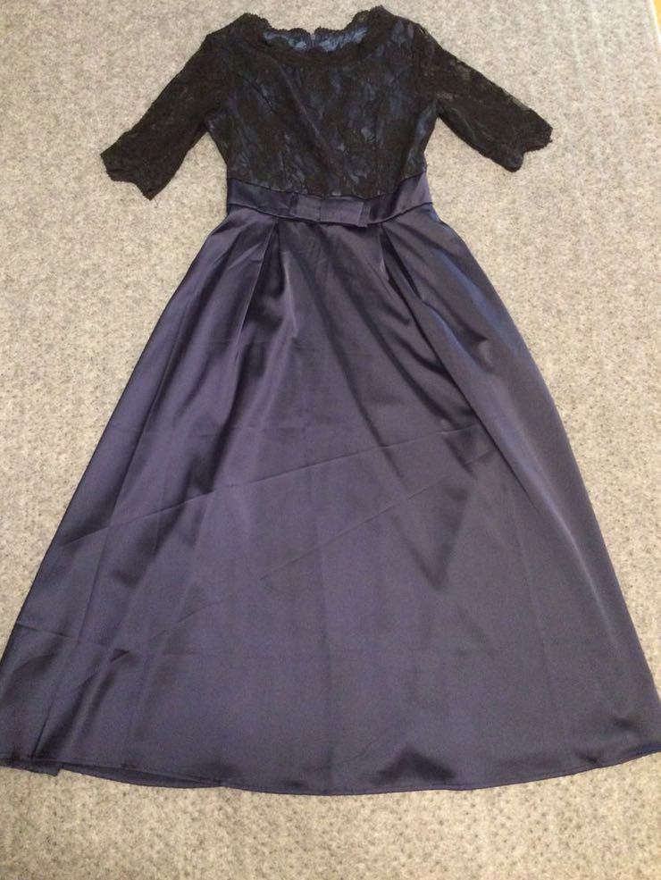 - ロングレースサテンドレス 発表会パーティーお呼ばれ結婚式演奏会 五分袖半袖 黒紺ブラックネイビーフォーマルダークカラー ウエストリボン
