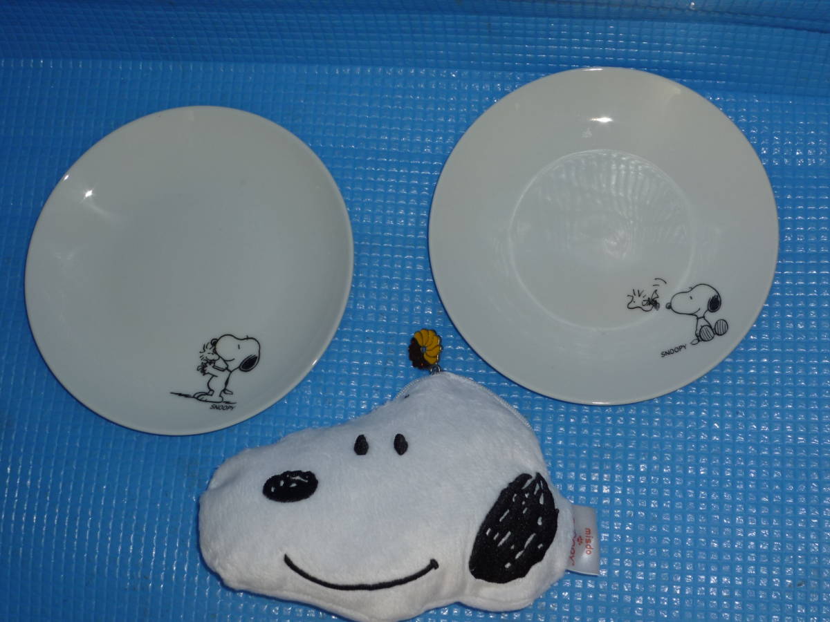 - E★未使用・非売品★ローソン×SNOOPYスヌーピー ペアプレート皿セットとミスド クッションポーチ