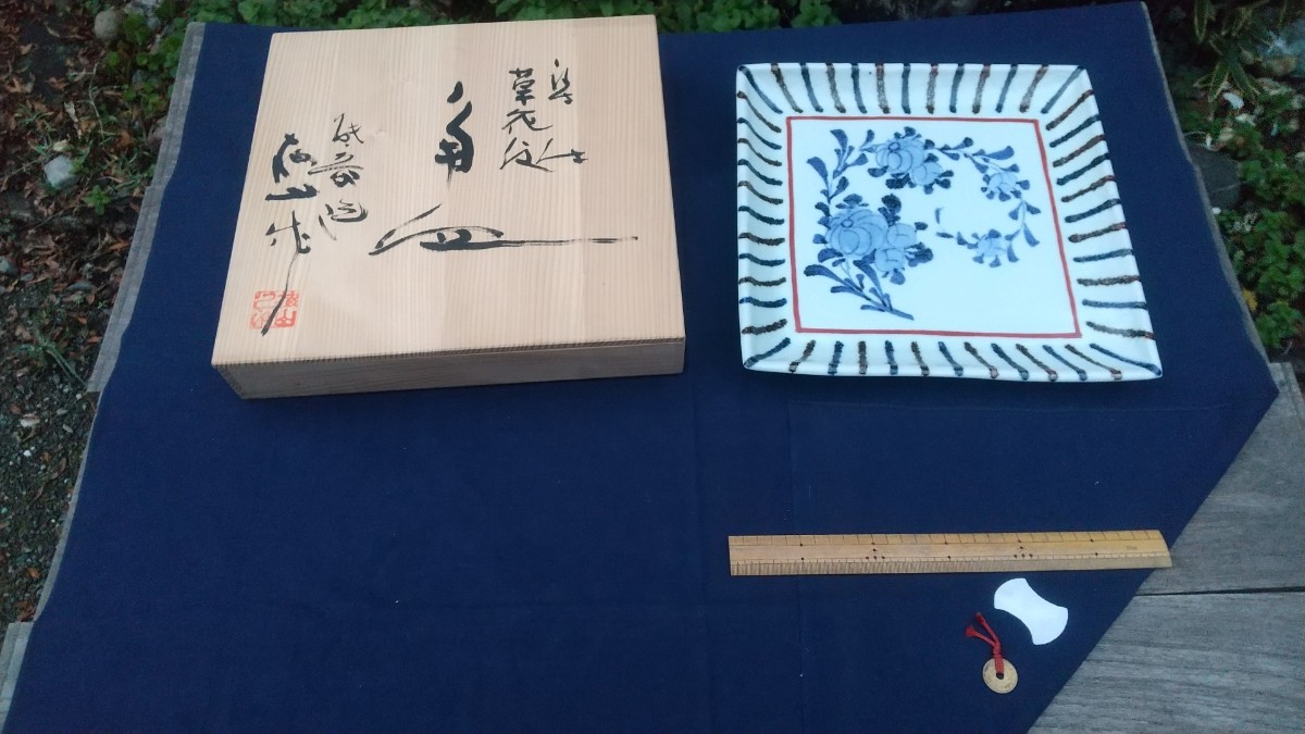 - 砥部焼 哲山作 角皿 共箱 記念品 布目菊紋 訳あり品