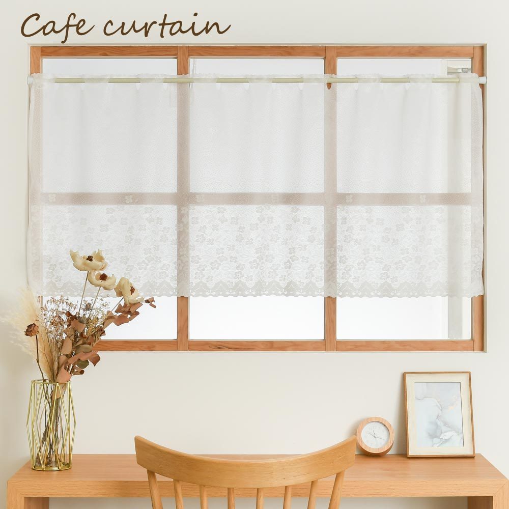 - カフェカーテン レース フラワー 花柄 おしゃれ 丈90cm 幅140cm 出窓 小窓 長め つっぱり棒 日本製 113