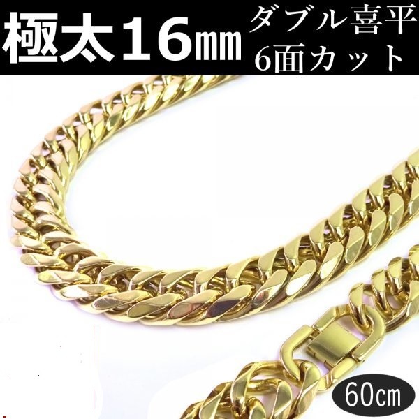 - ステンレス ダブル喜平ネックレス ゴールド 鏡面仕上げ 6面カット 中折れジョイント 極太 幅16mm 長さ 60cm