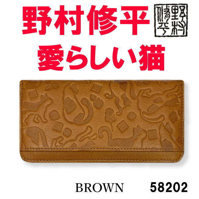 - ブラウン 野村修平 愛らしい猫の型 牛革 ラウンド 長財布 本革 58202