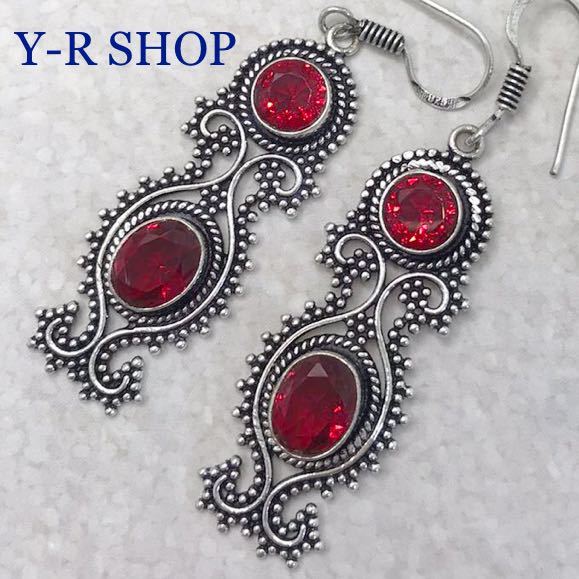 > ガーネットのアンティーク調ピアス★レディースカラーストーンアクセサリーシルバー 925刻印エスニックインドジュエリー新品Y-RSHOP宝石