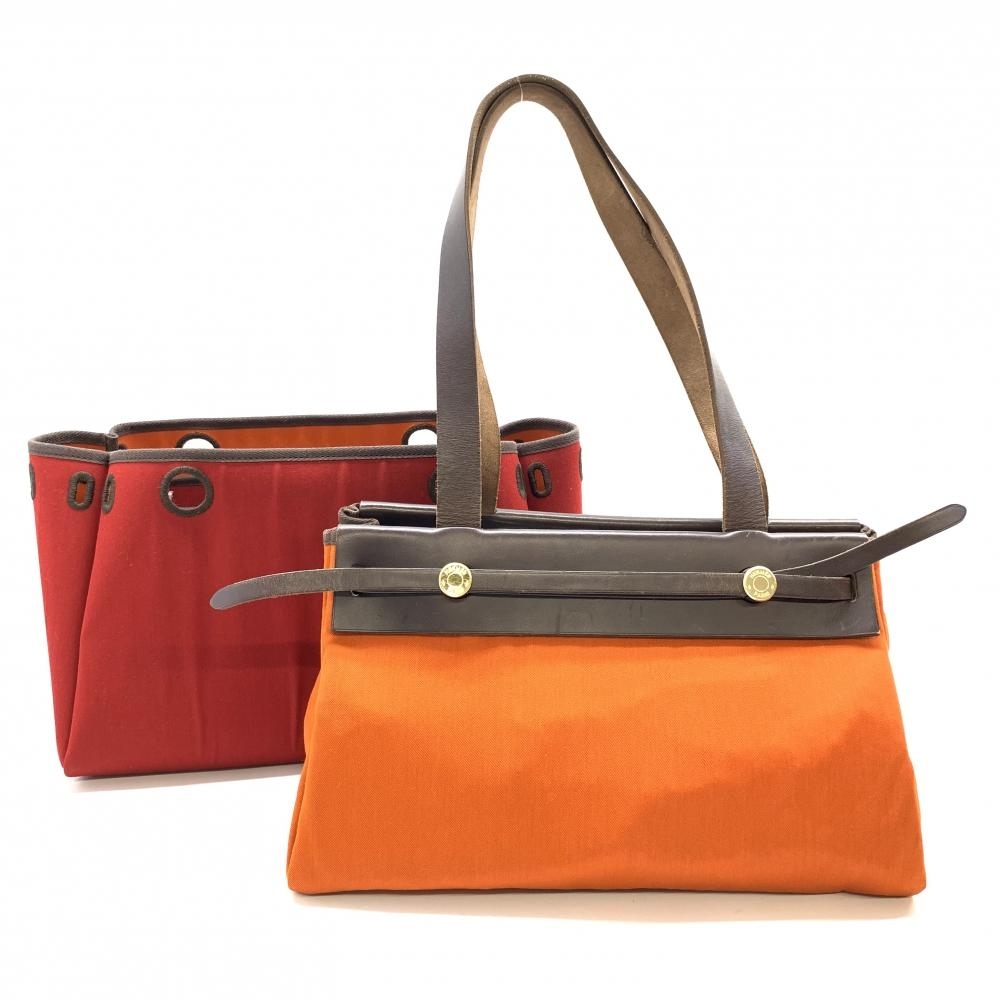 - HERMES エルメス カバスPM キャンバス 赤 オレンジ ゴールド トートバッグ ショルダーバッグ 替えバッグ レディース 管理RT35982