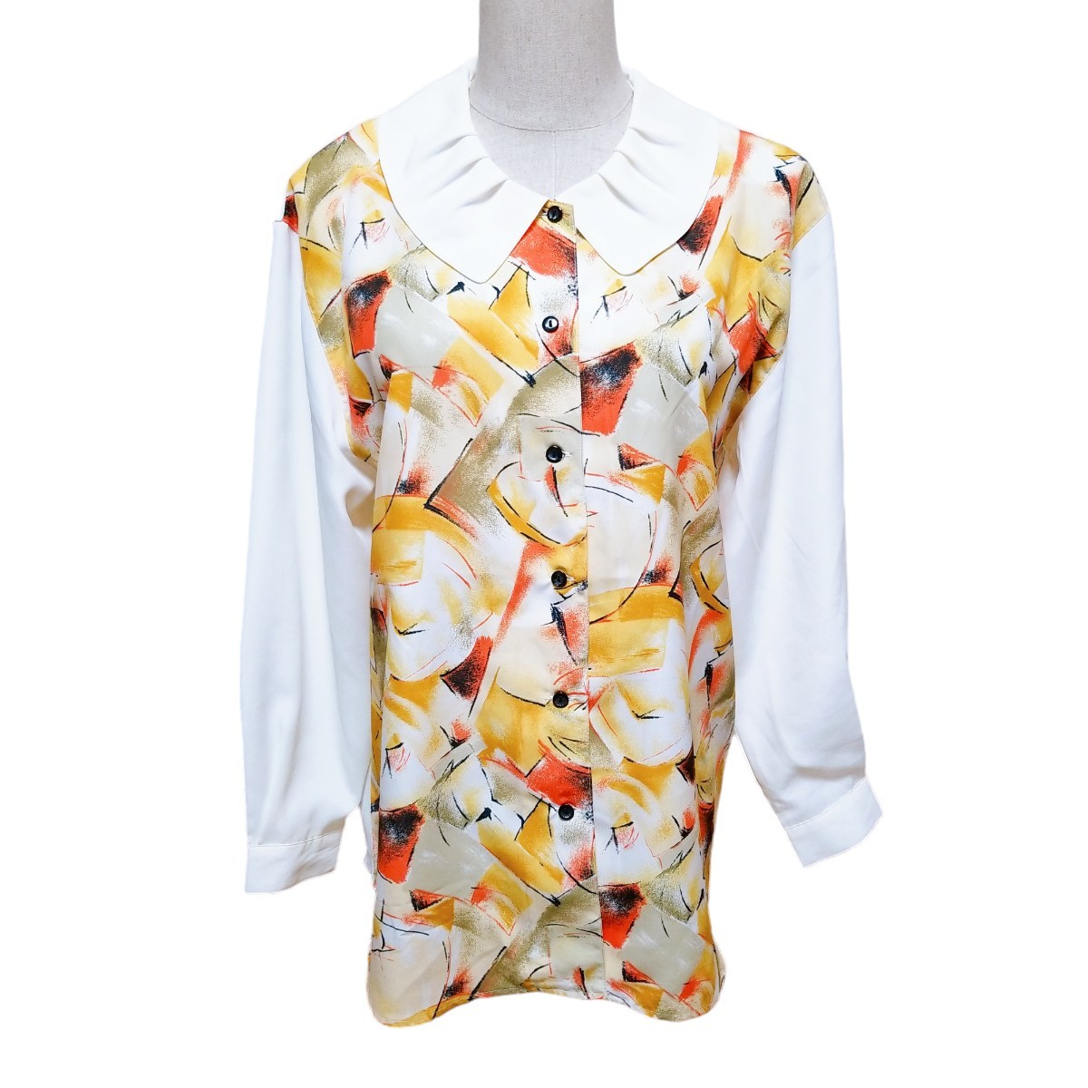 - 送料無料★Y1287 昭和レトロ フロントデザインシャツ ブラウス 長袖 レディース 9号 M ホワイト系 アート柄 無地 日本製 肩パッド入り