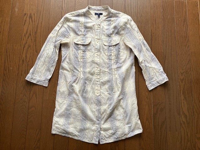 > ギャップ チェック 七分袖 スタンドカラー シャツ ブラウス S 身幅45㎝ 着丈73.5㎝ ベージュ系 ロールアップ 送料無料 底値