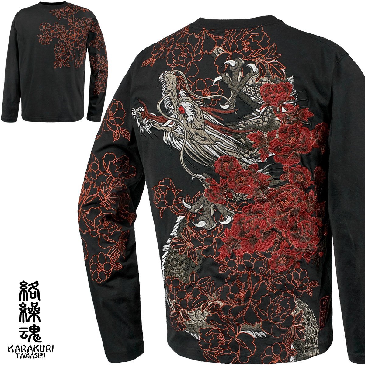> 241027-20 からくり魂 絡繰魂 粋 クルーネック 長袖Tシャツ 竜 牡丹 和柄 刺繍 ロンT mens メンズ(レッド赤ブラック黒) L 骸骨 国芳
