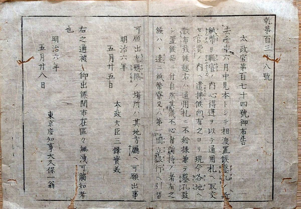 - f21101910〇明治布告布達 新紙幣 間違い 穿孔処理依頼 大久保一翁 太政大臣 三條実美 明治6年〇和本古書古文書