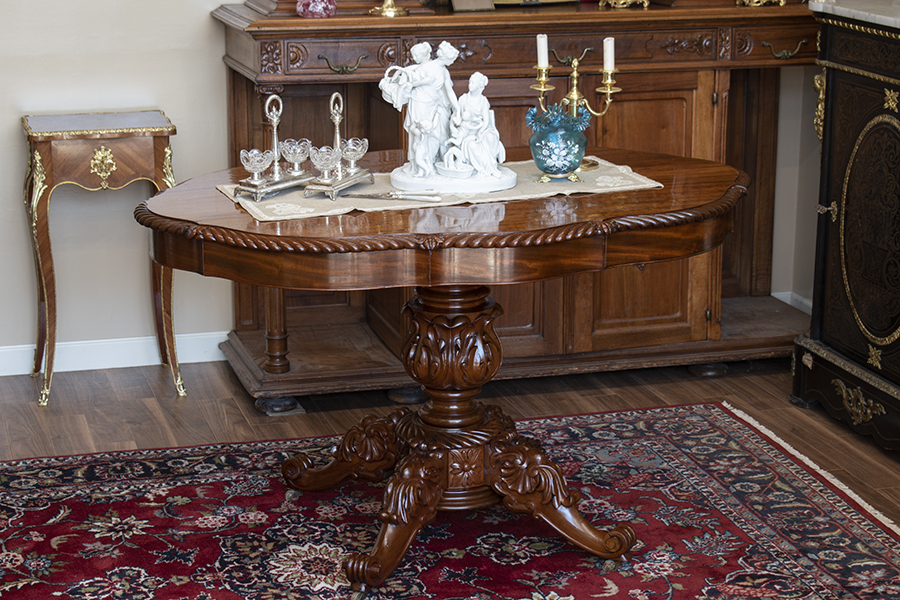 見るからにどっしりと安定感のあるこのテーブルは、マホガニーの深い赤茶色が大変美しく、曲線に沿って天然ニスの上品な艶が輝く、高級感たっぷりの一台です。