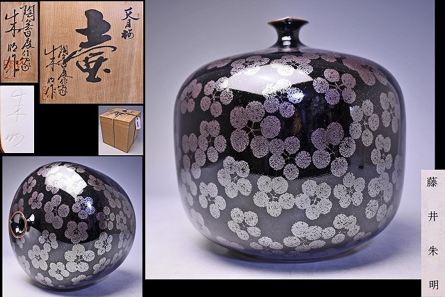 > 藤井朱明 ★ 天目釉 壺 ★ 共箱 栞 飾り木札 ★ 匠による銀色の花文が雅な逸品 ★ 花器 花入 ★ 有田 ★