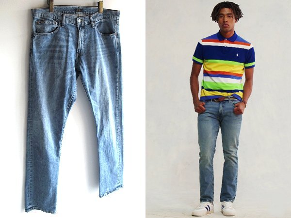 - POLO RALPH LAUREN ラルフローレン Varick Slim Straight Jeans ロゴ革パッチ ビンテージ加工 ストレッチデニムパンツ 36/34 インディゴ