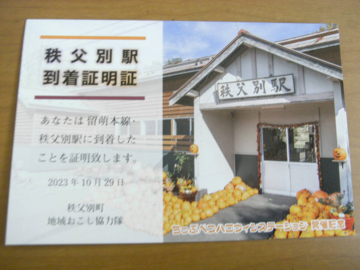 - 留萌本線 秩父別駅 到着証明証 2023年10月29日 秩父別地域おこし協力隊