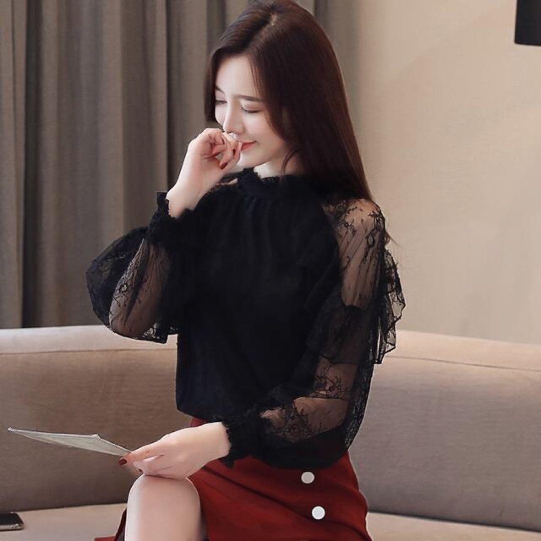 - シャツブラウス シフォン 透け感 花柄 袖フリル付き 長袖