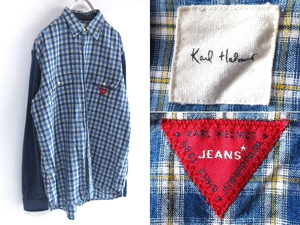 - Karl Helmut カールヘルム JEANS/ロゴワッペン コットン天竺切替 インディゴ チェックシャツ L 藍色 青 ブルー ピンクハウス カネコイサオ