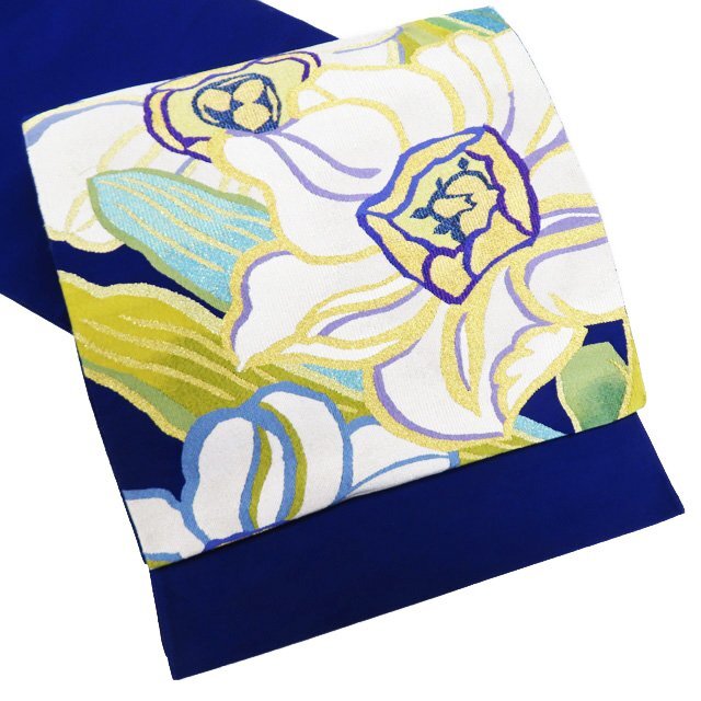 - 特選 袋帯 未使用 正絹 フォーマル 仕立て上がり お太鼓柄 やまと誂製 綴れ織 花の図 水仙 箔糸 群青色 多色 金銀 きもの北條 A989-10