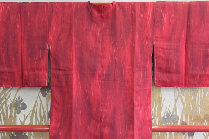 - きもの今昔6719 道行きコートコレクション 正絹紋意匠生地 木目模様地紋様えんじ色濃淡ぼかし染 身丈80cm