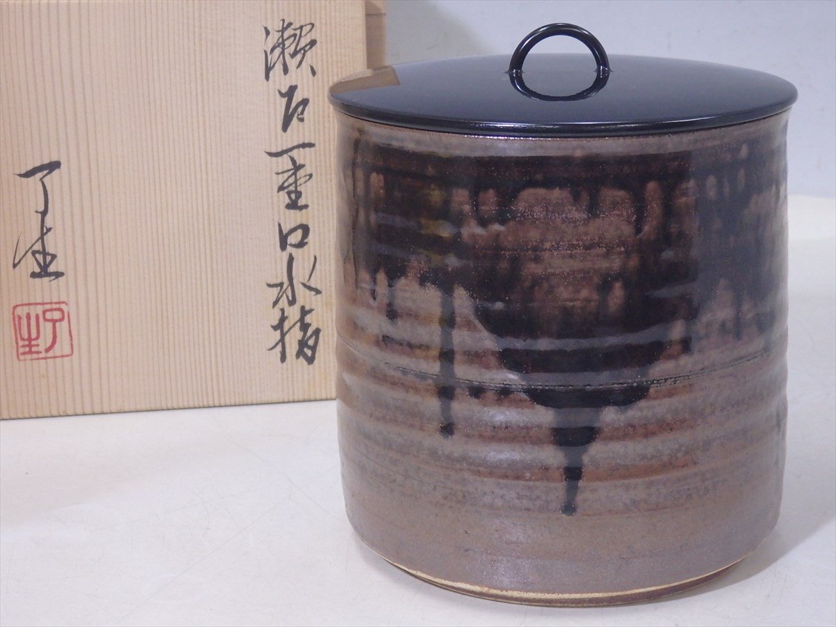 > ★状態良好!山月窯 川本了生【瀬戸一重口水指 共箱】蓋は木製真塗り 直径15.3cm 高さ17.5cm 茶道具 茶器 参考価格21800円