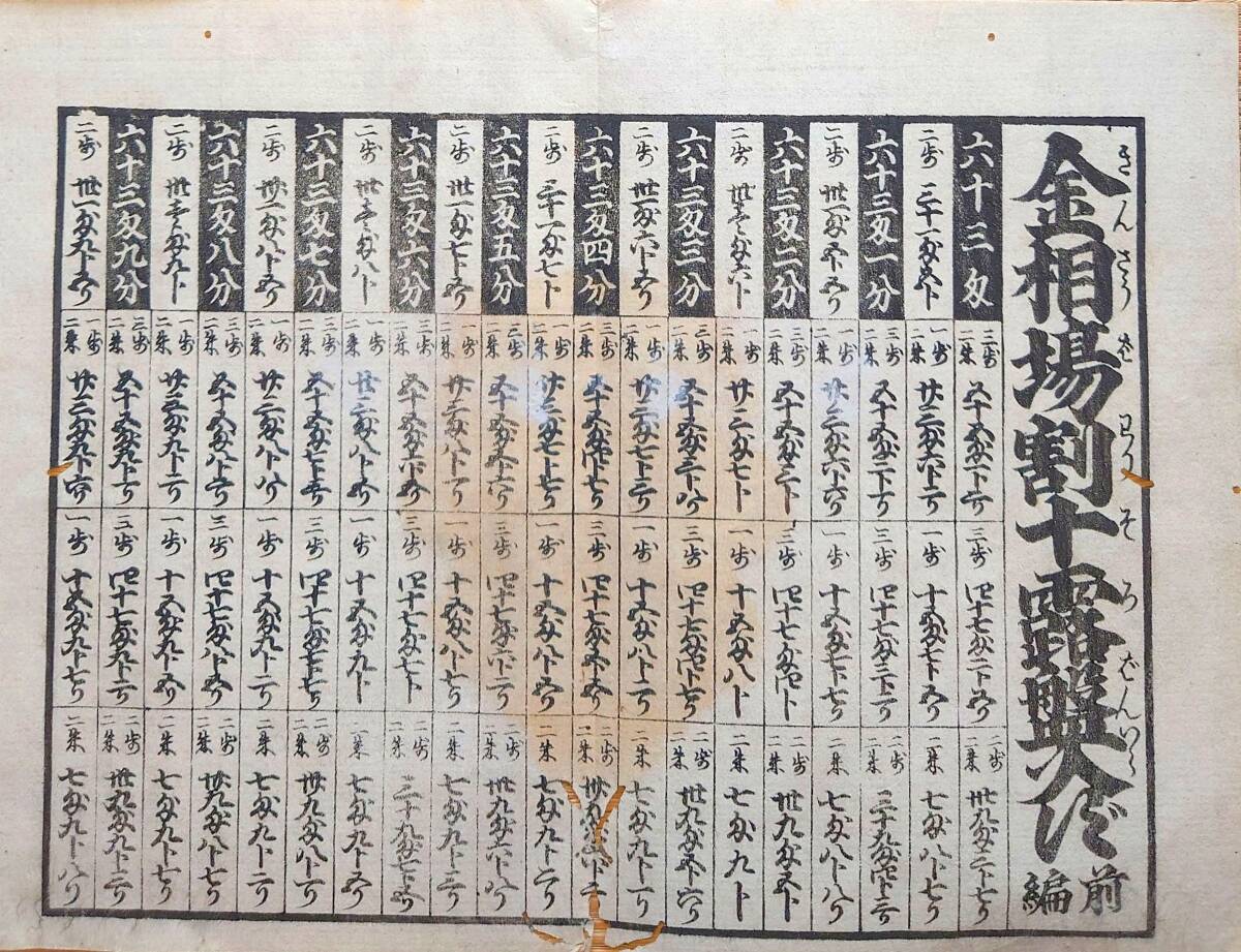 - f240409116〇一枚刷り 和紙木版 浪花みやげ初編 金相場割十算盤要らず 前編 ことば遊び しゃれ なぞ 判じ絵 見立番付 天保年間 塩屋