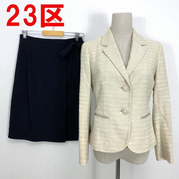 - A2402 23区 スカートスーツセット 綿 ツイード 白 コットン テーラードジャケット 裏地あり ホワイト ひざ丈スカート アイボリー 黒 38