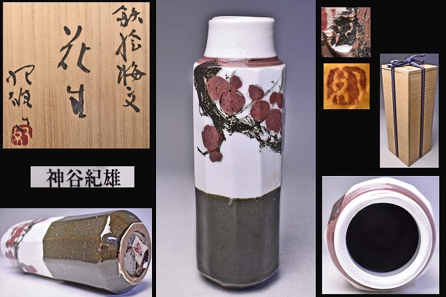 > 神谷紀雄 ★ 鉄絵梅文花生 ★ 共箱共布栞 ★ 鉄絵銅彩タイプ ★ 人間国宝 田村耕一 師事 ★ 益子焼 窯元出身 ★ 花入れ