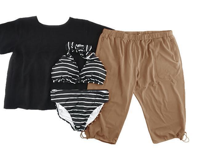- レディース水着 4点セット カーゴパンツ付き 水陸両用 体型カバー 大きいサイズ 3L ボーダー柄 ブラック