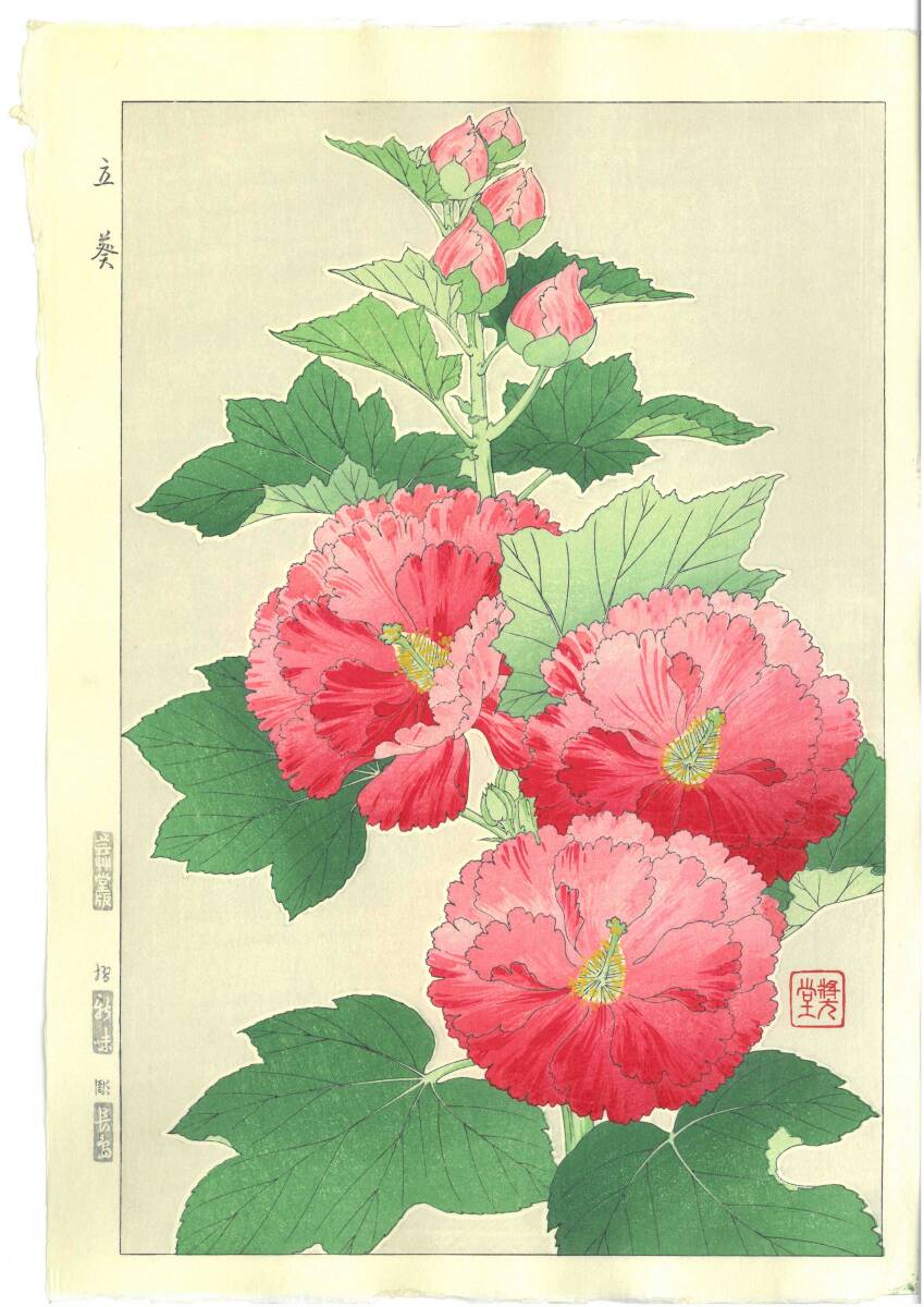- 真作保証 河原崎奨堂 木版画 #81 立葵 Hollyhock 花版画 初版昭和中期~ 京都らしい花版画の美をご自宅でお楽しみください。