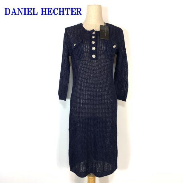 > ダニエル エシュテル タグ付きかぎ針編み長袖ワンピースネイビーDANIEL HECHTER 透かし編み 透け感有 胸ポケット リブ袖 コットン 2 C9832