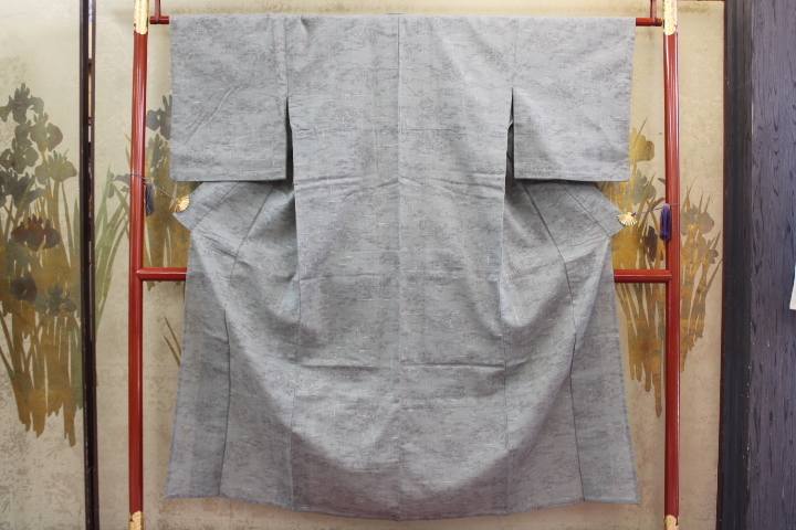 - きもの今昔6868 単衣のきもの バチ衿共布居敷当て 正絹ヨコ節糸ネップ入り 抹茶色地先染め絣柄 身丈143cm