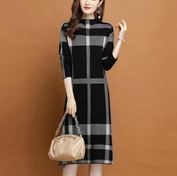 - LC204 Fサイズ 秋冬 素敵な チェック柄 カシミヤウール混 気質 ニットひざ丈ワンピース フォーマル 大人 厚地 暖かい 黒