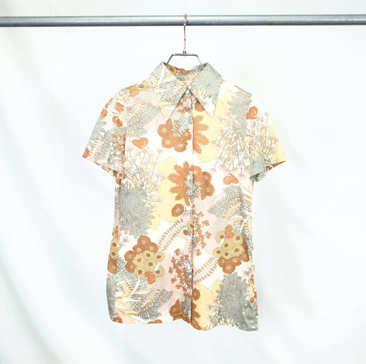 > 【1960〜70s】ビンテージ 総柄 半袖シャツ ニットポロ ヒッピーデザイン アロハシャツ ハワイアンシャツ 古着屋 アート
