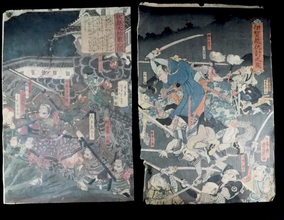 > 浮世絵木版画 合戦絵作品2枚セット 錦絵 歌川芳年「伏見大地震之図」歌川国貞「伊賀越仇討之図」SMN604(25-2)