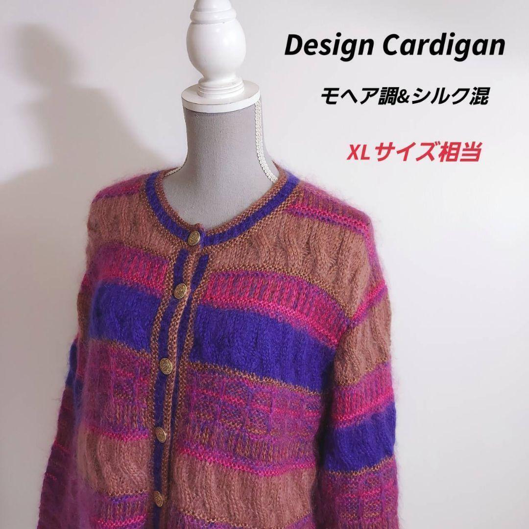 > マルチカラー・金ボタン&シルク・モヘア風ニット カーディガン レトロ古着 キララ 紫&ショッキングピンク&ブラウン&ラメ混 五点で送料無料