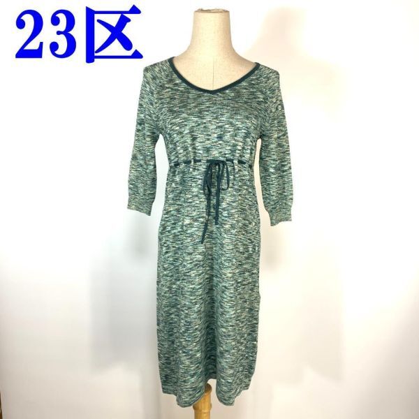 - 23区 ロングワンピース ニット 七分袖 ウエストリボン 緑 グリーン ラメ 38 C9905
