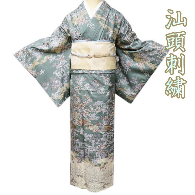 > 特選 訪問着 着物 中古 紬地 セミフォーマル 汕頭刺繍 作家物 色紙付き 青竹色 多色 金 身丈166cm 裄67.5cm L トール きもの北條 A1030-8