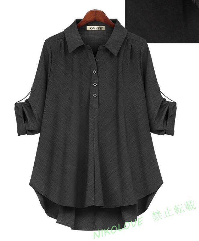- 新品カジュアル ゆったり 無地 コットン リネン 大きいサイズ おしゃれ 普段着 長袖 ブラウスシャツ黒 L-4XL LH022