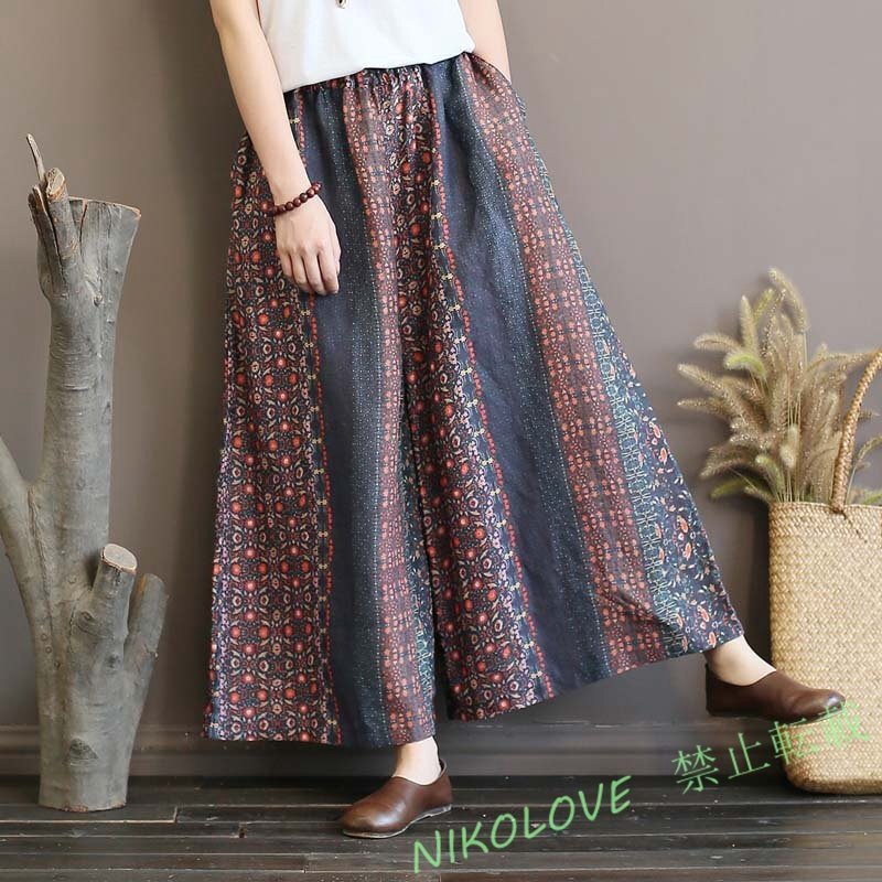 - 新品レトロ ベルトをゆるめる ゆとり カジュアル プリント柄 切り替え ワイドパンツ 赤紺系 LE988