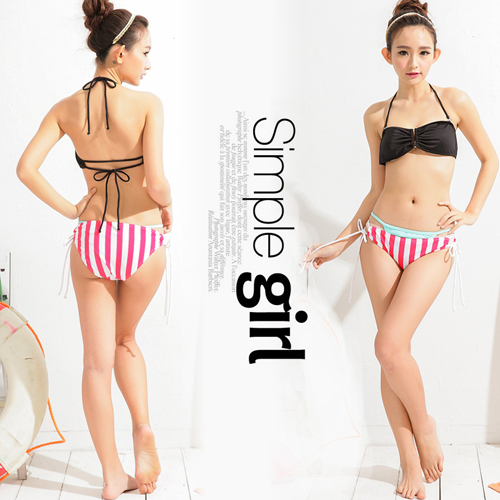 - D1414/11L 新品 水着 ★2点セット ビキニ バンドゥ ストライプ ホルターネック 胸パッド ブラック 黒×赤×白 お洒落 可愛い レディース